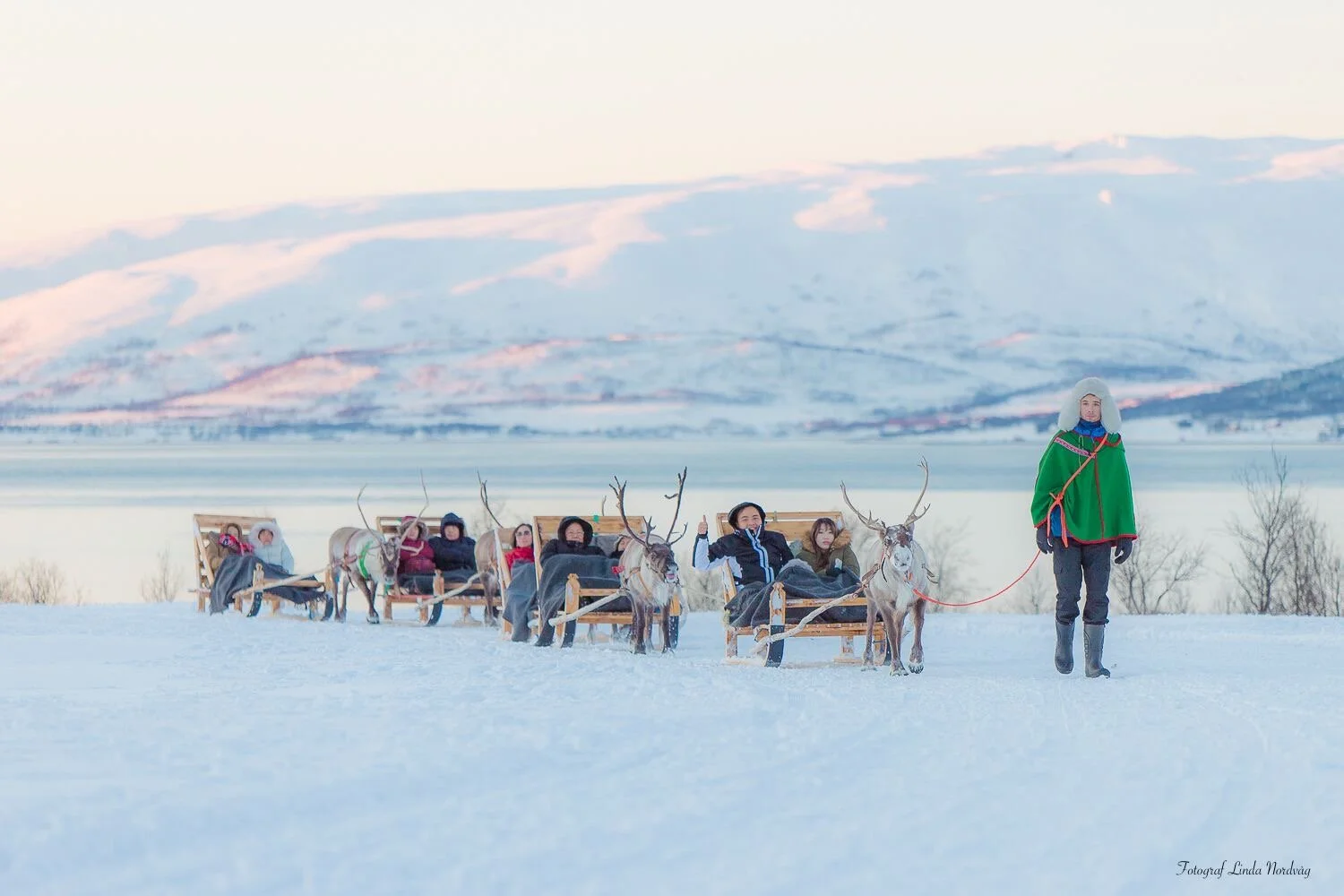 Enjoy a 10 to 15-minute sleigh ride (or optional 25 minutes) as the reindeer guide you around the valley and along the coast. Afterwards, you will have the opportunity to feed 300 of these magnificent animals before entering the gamme for a hot traditional meal cooked over the fire. Finish the day by gathering around the fire to listen to Sami history, stories and joiking (songs).